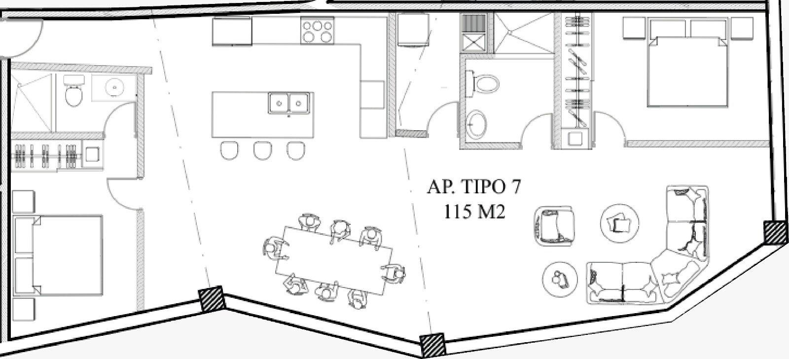 La tipología más amplia del proyecto propone una experiencia residencial premium, con dos habitaciones independientes, cada una con baño privado, además de generosas áreas sociales diseñadas para compartir y disfrutar.